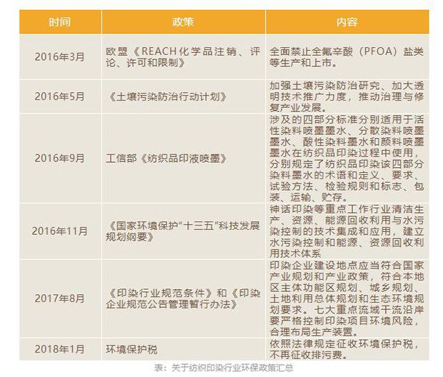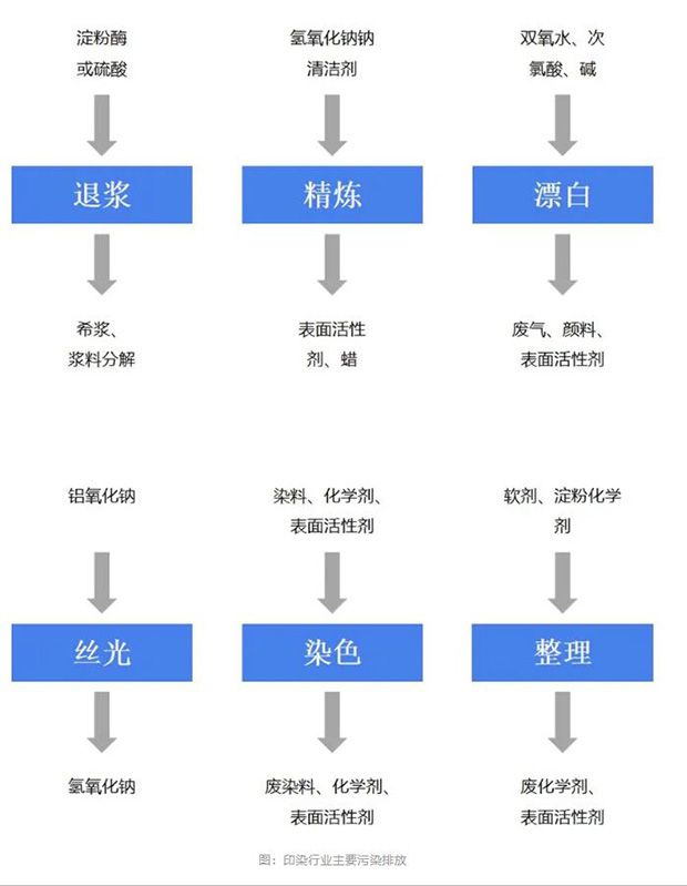 印染流程中除了消耗大量能源以外,同時(shí)需投入大量的水和化工原料,從而產(chǎn)生大量的污水排放。印染傳統(tǒng)工藝中包括退漿、精煉、漂白、絲光、染色、整理、干燥、成品8個(gè)步驟。其中每一個(gè)步驟都需要大量原輔料、化學(xué)試劑投入,產(chǎn)生大量廢水及污染物。目前國(guó)內(nèi)環(huán)境問(wèn)題依然嚴(yán)峻,印染行業(yè)作為典型的高耗能、高排放行業(yè),其發(fā)展對(duì)國(guó)家和地方環(huán)保政策高度敏感。