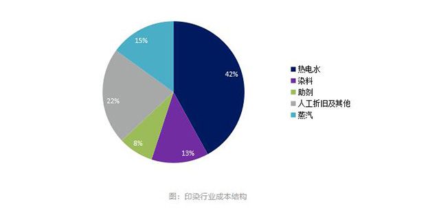 印染企業(yè)運(yùn)營(yíng)模式不同,大致分為來(lái)料加工、自行采購(gòu)加工和自產(chǎn)自加工三種模式,其中以來(lái)料加工為主,如上市公司航民股份。印染成本主要包括熱電、染料、助劑、人工等。作為典型的高污染、高耗能行業(yè),印染企業(yè)熱電、水等傳統(tǒng)能源成本占比在40%以上,對(duì)比下,染料成本只占約20%。